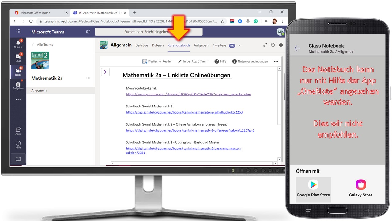 - Das Kursnotizbuch wird in der mobilen App nicht angezeigt. Dazu müsste eine weitere App, nämlich OneNote, heruntergeladen werden. Ich empfehle darauf zu verzichten, wenn man OneNote nicht noch für andere Sachen benutzen möchte.