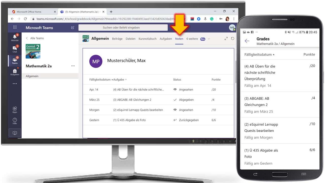 - In der Registerkarten Noten, siehst du die bereits von der Lehrerin benoteten Aufgaben.