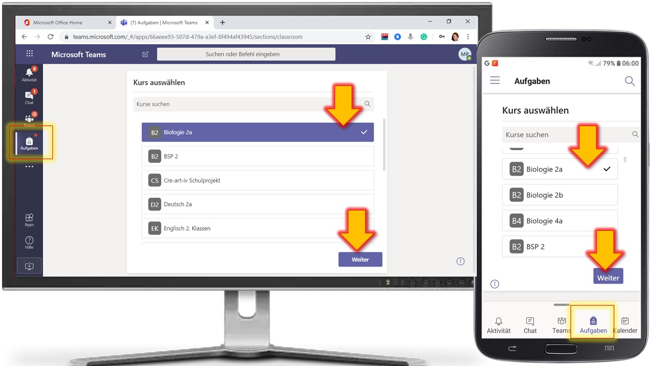 - Hier muss man den Kurs auswählen und sieht danach die Aufgaben des jeweiligen Kurses.