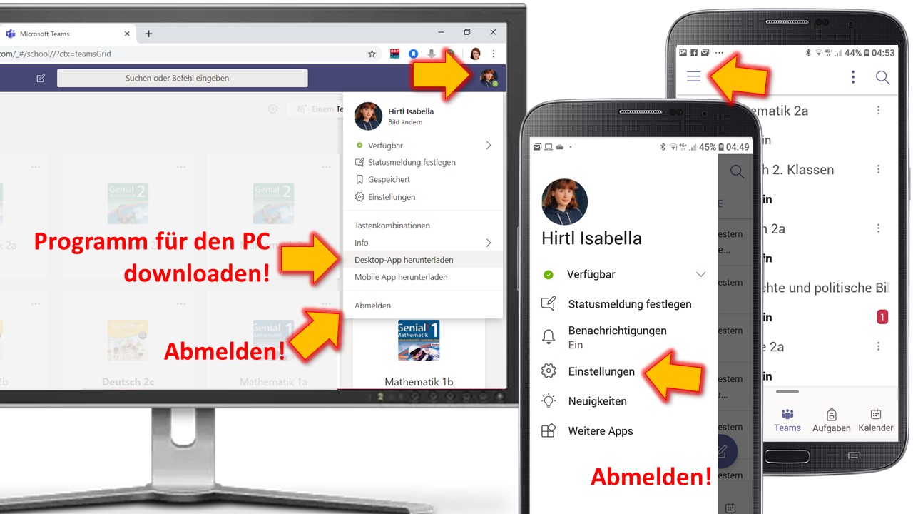 - Am SMARTPHONE: Links üben auf das Menüsymbol mit den Strichen, dann auf „Einstellungen“ und auf „Abmelden“.