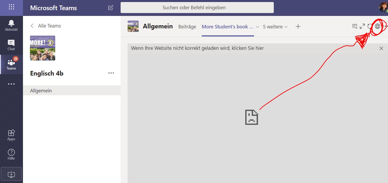 - Wenn ihr in einem Kurs eine Website verlinkt habt und diese sich in Teams nicht öffnen lässt, klickt auf das Symbol oben rechts, das aussieht wie ein Globus. Dann werdet ihr auf die Website weitergeleitet.