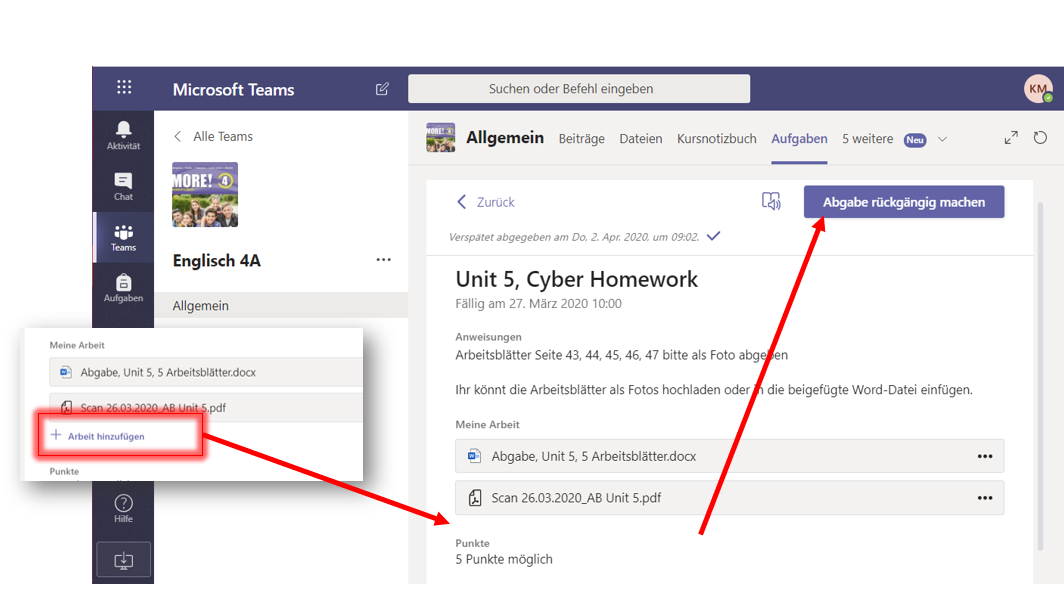 - Wenn das passiert ist, nachdem ihr die Aufgabe schon abgegeben hattet, könnt ihr jetzt durch das Klicken auf „Abgabe rückgängig machen“, wieder neue Datum:ien hinzufügen.