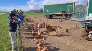 Zu Beginn holte uns Frau Pretz am Bahnhof ab. Nach der Begrüßung schlossen wir uns einer kleinen Wanderung zu den Hühnern an. Nach dem Kennenlernen einiger Getreidesorten halfen wir beim Abnehmen der frischen Eier. Außerdem fütterten wir die Ziegen, was uns viel Freude bereitete. Ein weiteres Highlight war das gemeinsame Essen von gekochten Eiern – eine tolle Gelegenheit, die Hühner dann mit den Schalen zu füttern.